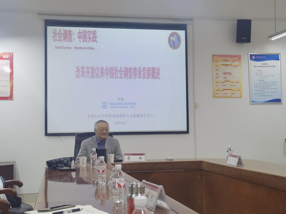 2025年4月28日,为提升我院的社会调查水平和能力,邀请中国社会科学院研究员、中国社会综合状况调查总执行人李炜老师来我院做专题讲座。报告会在教科楼B座656会议室召开,由龚文海院长与陈伟涛副院长主持,中国社会科学院兰雨博士和我院的部分师生参加了此次报告会。